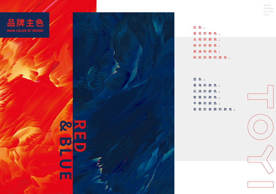 5.品牌色彩:品牌選擇了紅色和藍(lán)色作為主色調(diào),這兩種顏色不僅鮮明而且易于辨識(shí),再配上白色和黑色,形成了TOYI童裝獨(dú)特的品牌色彩體系。